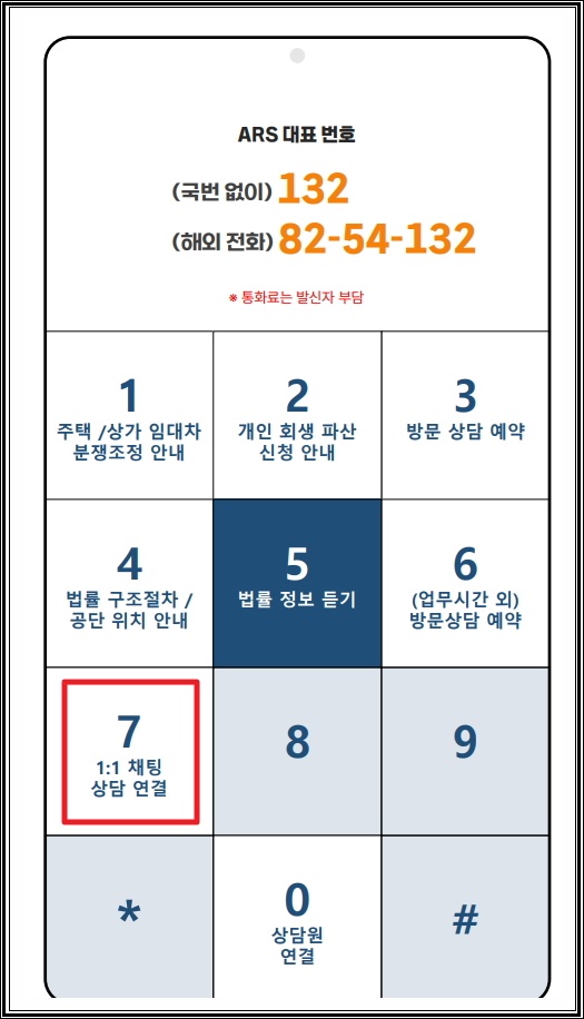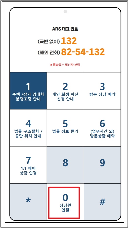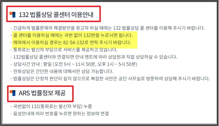 1. 그럼 먼저 콜센터를 이용한 법률상담 서비스에 대해 알려 드릴게요. 일단 전화번호는 쿠폰 없이 132번을 누르면 되는데요, 상담 서비스에 대해서는 무료이지만, 통화료는 발신자 부담입니다. 이 점을 꼭 알고 해당 서비스를 이용하시길 바래요. 통화 시간이 길어질 것 같으면 인터넷을 이용한 사이버상담을 이용하는 것이 좋다고 생각합니다. 통화료가 발생하지 않기 때문이에요. 해외에서도 해당 서비스를 무료로 이용할 수 있는데요. 이때에는 앞에 82번과 54번을 추가로 입력해야 합니다. 해외에서 전화하는 경우에는 비싸다고 알려진 국제 통화료가 발생할 수 있으니 이점을 꼭 참고해 주시기 바랍니다.