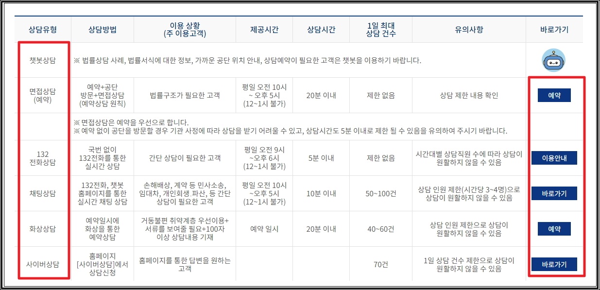 7. 이곳에서 제공하는 여러 가지 법률 서비스를 표로 나타낸 것입니다. 총 여섯 가지 정도가 되는데요. 자신에게 알맞는 것을 선택하여 이용하시면 됩니다. 각자 장단점이 있어서 무엇이 좋다고 콕 찍어서 말씀드리기 어렵습니다.