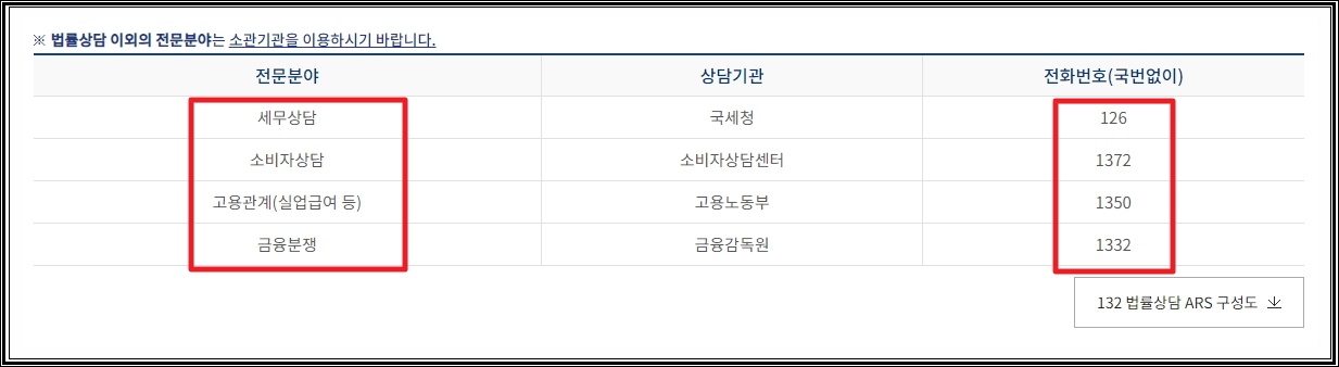 3. 법률상담 외에 다른 전문 분야는 그에 맞는 전화번호가 따로 마련되어 있습니다. 여기서 언급하는 전문 분야는 네 가지인데요. 세무, 소비자, 고용관계, 금융분쟁 이렇게 네 가지입니다. 이에 따른 전화번호도 위 표에 나와 있으니 참고하시길 바랍니다.