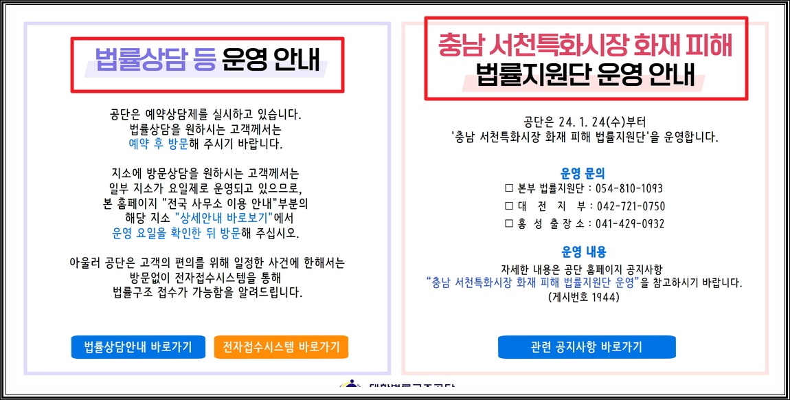 6. 오랜만에 사이트에 접속해 보니 법률상담에 관련된 운영 안내 문구가 있네요. 이러한 부분도 꼭 참고하시길 바랍니다. 그리고 최근에 충남 서천 특화시장 화재 피해를 받으신 분들이 있는데요. 법률 지원단 운영 안내 사항이 있으니 이 부분을 꼭 읽어 주세요.