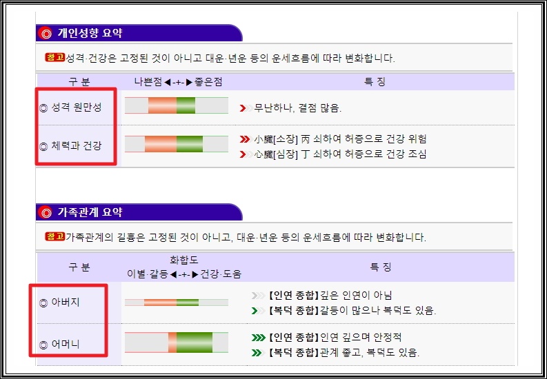 5. 그 다음으로는 만세력을 기반으로 한 사주개요 및 특징을 살펴보도록 하겠습니다. 가장 먼저 개인의 성향에 대해 나타나는데요. 성격, 원만성과 체력, 건강에 대한 내용을 보여 주고 있네요. 그 다음으로는 나와 가족 관계에 대하여 나타나는데요. 화합도와 특징 부분을 읽어 보면 됩니다.