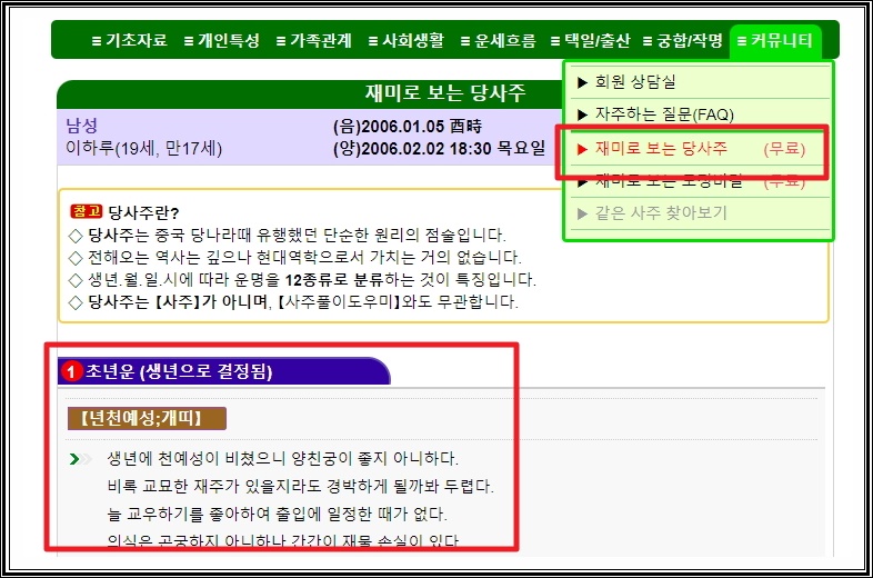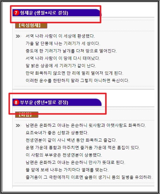 형제운, 부부운, 자녀운, 직업운 등 인생에서 중요한 각 요소에 대하여 상세한 풀이를 보는 것도 가능해요.