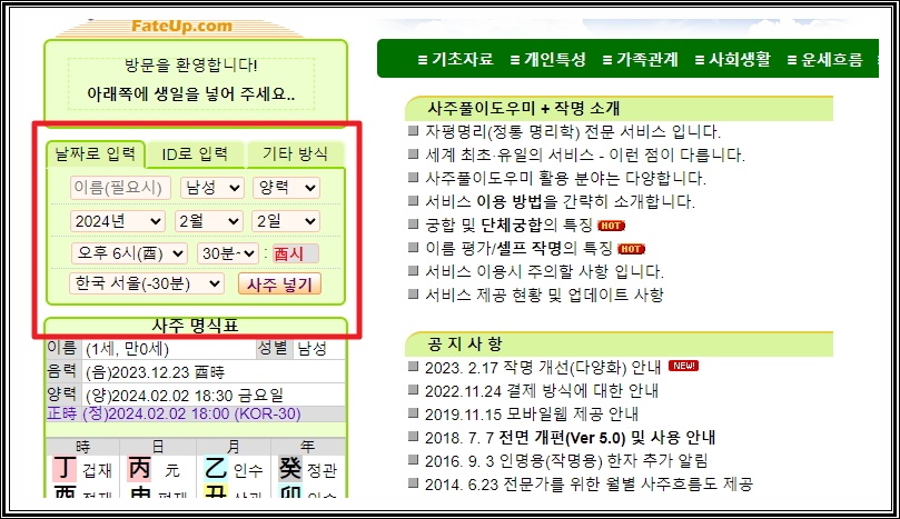 2. 먼저 사이트에 접속하면 좌측에 있는 날짜로 입력 부분에 이름, 성별, 생년월일, 태어난 시각 등을 입력해 주세요. 다 입력했으면 “사주 넣기” 버튼을 누릅니다.