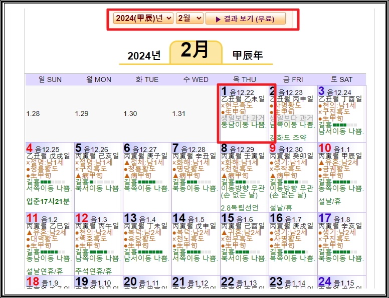 4. 먼저 택일 만세력의 화면이 나타났어요. 내가 보고 싶은 달력을 선택할 수 있는데요. 달력에 표시된 내용을 보면 쉽게 무엇을 의미하는지 알 수 있습니다. 만세력을 기반으로 이날이 좋은 날인지 또는 그렇지 않은지 알 수 있죠. 방향에 대해서도 알려 주는데요. 이사를 가거나 데이트를 할 때 이러한 내용을 참고할 수 있습니다.
