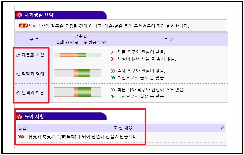 6. 사회생활에 대한 내용도 볼 수 있는데요. 재물, 사업, 직장, 명예, 인격, 학문 이렇게 다방면으로 나의 운명이 어떠한지 알 수 있어요. 일부 사람들에게는 특이 사항도 나타나 있으니 참고하시기 바랍니다.