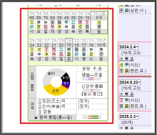 9. 이런 식으로 나의 대운, 연운, 오행, 격국 등에 대하여 전문가가 보면 알 수 있도록 결과를 알려 줍니다. 만세력 보는 방법을 배운 분이라면 이걸로 보는 것도 가능할 거예요.