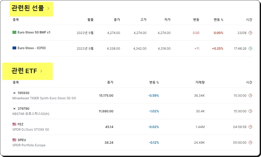 ▼ eurostoxx50에 관련된 ETF 상품에 투자도 가능한데요. 국내 및 해외에서 거래할 수 있는 ETF 상품이 보이네요. 그리고 관련 선물에 대한 정보도 나와 있습니다.