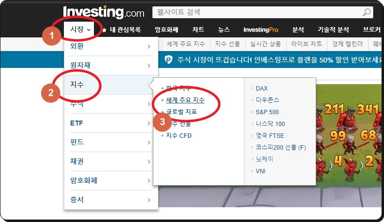 ▼ 인베스팅 사이트에 접속했습니다. 메뉴에서 [시장]을 선택해 보세요. 그럼 여러 가지 금융 상품이 나타나는데요. 여기에서 [지수]와 [세계 주요 지수]를 차례대로 선택합니다.