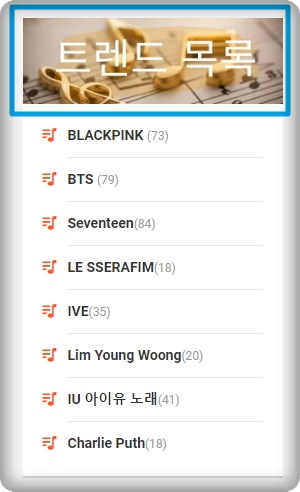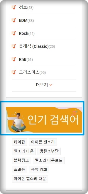 3. 우측에 보면 여러 가지 리스트가 나타나는데요. 트렌드 목록, 주간 차트, 카테고리, 인기 검색어 이렇게 네 가지 리스트가 있습니다. 이를 통해 보면 국내 인기 곡이 꽤 많이 있다는 것을 알 수 있어요. 다른 벨소리 다운 받는 곳에 비해 우리나라 사람들이 좋아할 만한 곡이 많은 편이라고 할 수 있습니다.