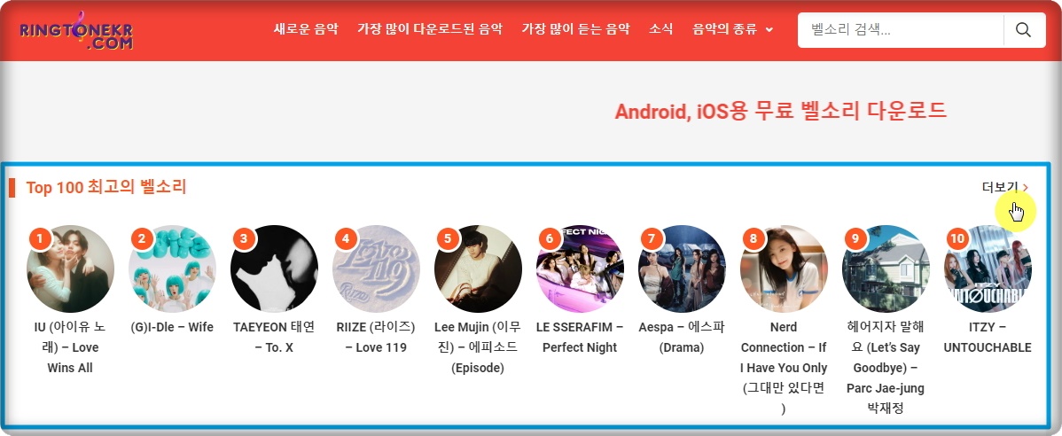 2. 사이트에 접속했습니다. 아이폰을 사용하시는 분들은 iOS용 벨소리 음원을 다운 받으시면 되고, 삼성 갤럭시나 기타 스마트폰을 사용하시는 분들은 안드로이드용 벨소리 음원을 다운 받아 사용하면 돼요. 맨 처음에는 TOP 100 최고의 음원 목록이 나오는데요. 여기서 더 보기 버튼을 누르면 11위부터 100위까지 확인할 수 있습니다.