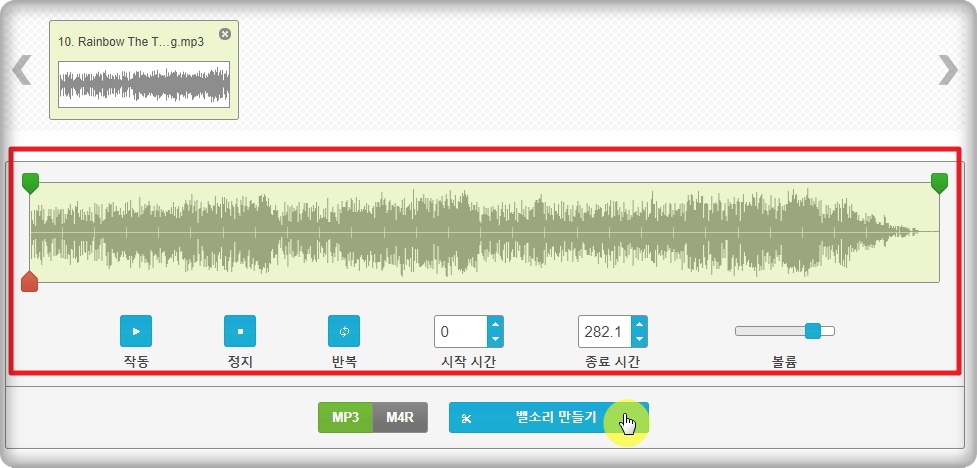 8. 음악 파일을 업로드한 이후에는 이렇게 벨소리로 만들고 싶은 구간을 지정해주면 되는데요. 미리 듣기를 통해 들으면서 만드는 것이 가능합니다.작업을 완료하였으면 [벨소리 만들기] 버튼을 눌러주세요.