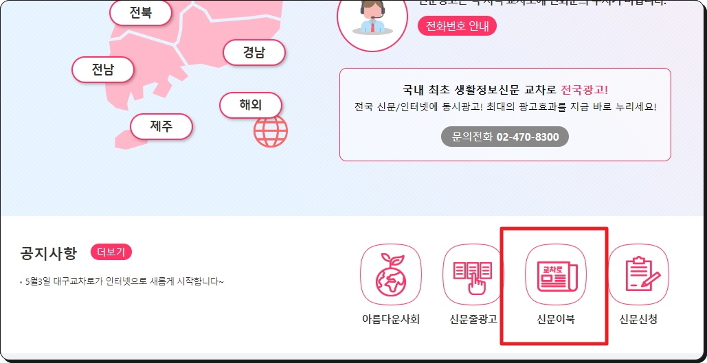 2. 공식 사이트에 접속하면 우측 하단에 신문 이북 메뉴가 있습니다. 해당 메뉴를 선택해 주세요.