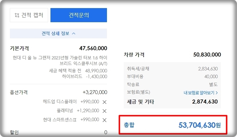 우선 제가 뽑아본 신차가격표 예시입니다. 여기도 보면 알 수 있듯이 같은 모델을 선택한다고 하여도 기본 가격은 동일하지만, 그 외에 추가가 되는 옵션 가격, 할인, 혜택, 관련 비용은 구매자 혹은 구매자의 선택에 따라 달라집니다. 그렇기 때문에 단순하게 어떤 자동차가 얼마다라고 하기 어렵고, 제가 알아보는 방식이 정확합니다.