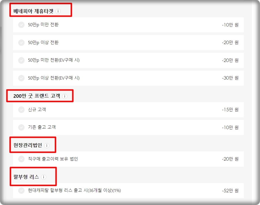 마지막으로 판매조건에 대한 것인데요. 본인이 활용할 수 있는 혜택을 선택해주세요. 그럼 그만큼 신차가격표에서 빠집니다.