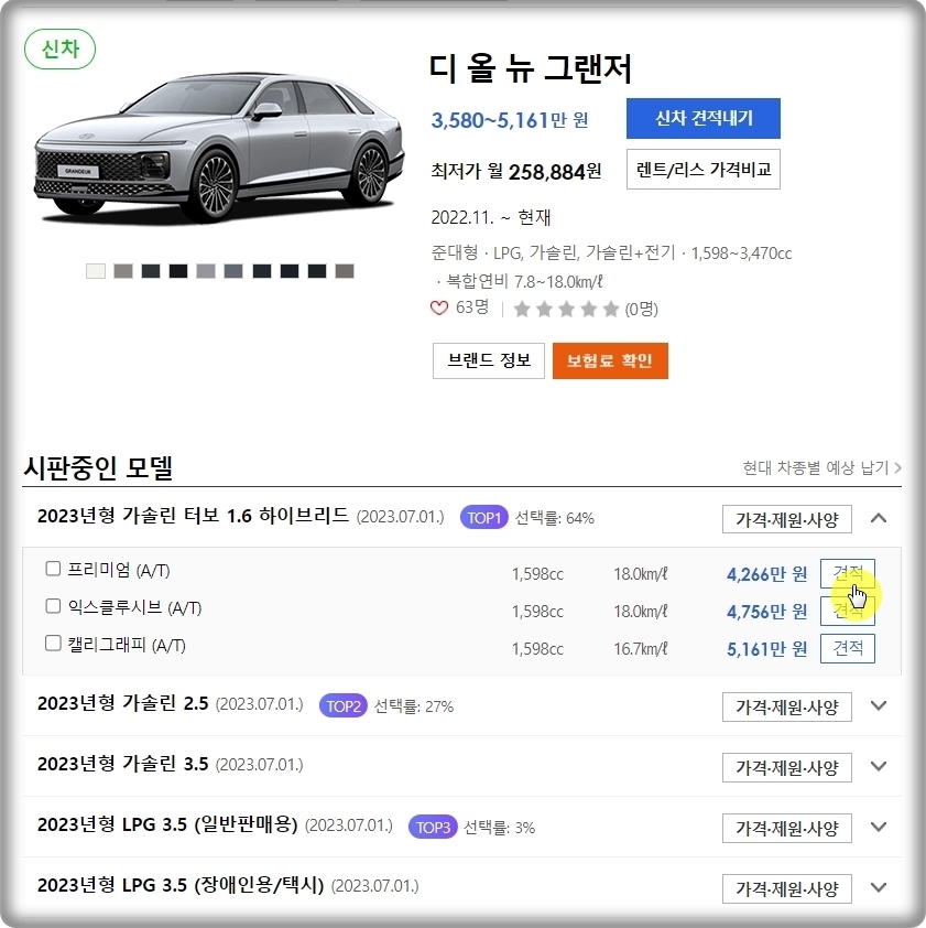 제가 선택한 조건을 충족하는 모델이 여러 개의 나타났는데요. 여기서 보면 알겠지만, 판매 금액이 범위 형태로 되어 있습니다. 그렇기 때문에 몇 가지 선택을 하여 정확한 최종 금액을 살펴보아야 하는데요. 마음에 드는 모델과 세부모델을 선택한 후 옆에 있는 견적 버튼을 눌러 주세요.