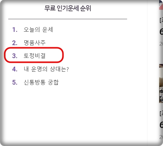 사이트에 접속하면 좌측 상단에 있는 전체 메뉴 버튼을 눌러 보세요. 그 다음 신년운세 카테고리에서 "더보기" 버튼을 눌러줍니다. 그럼 좌측 하단에 무료 운세 순위가 나타나는데요. 여기에서 세 번째에 있는 토정비결을 마우스로 클릭해 주세요. 이외에도 궁합이나 사주를 보고 싶은 분들은 무료 인기 순위에서 선택하면 됩니다.
