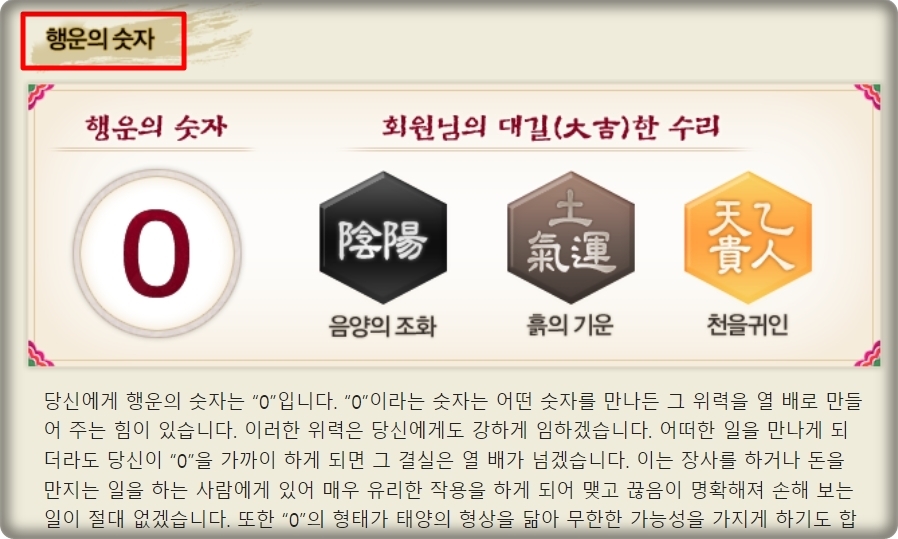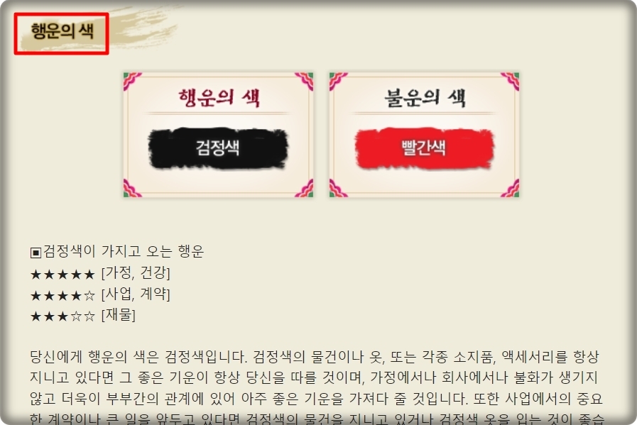 다른 토정비결 사이트와는 다르게 이곳에서는 행운을 가져다 주는 것에 대해서도 안내해 주는데요. 행운의 숫자와 색을 추천받을 수 있습니다. 좀 더 나에게 행운이 찾아오길 바라신다면 이러한 것들을 활용해 보시길 바랍니다.