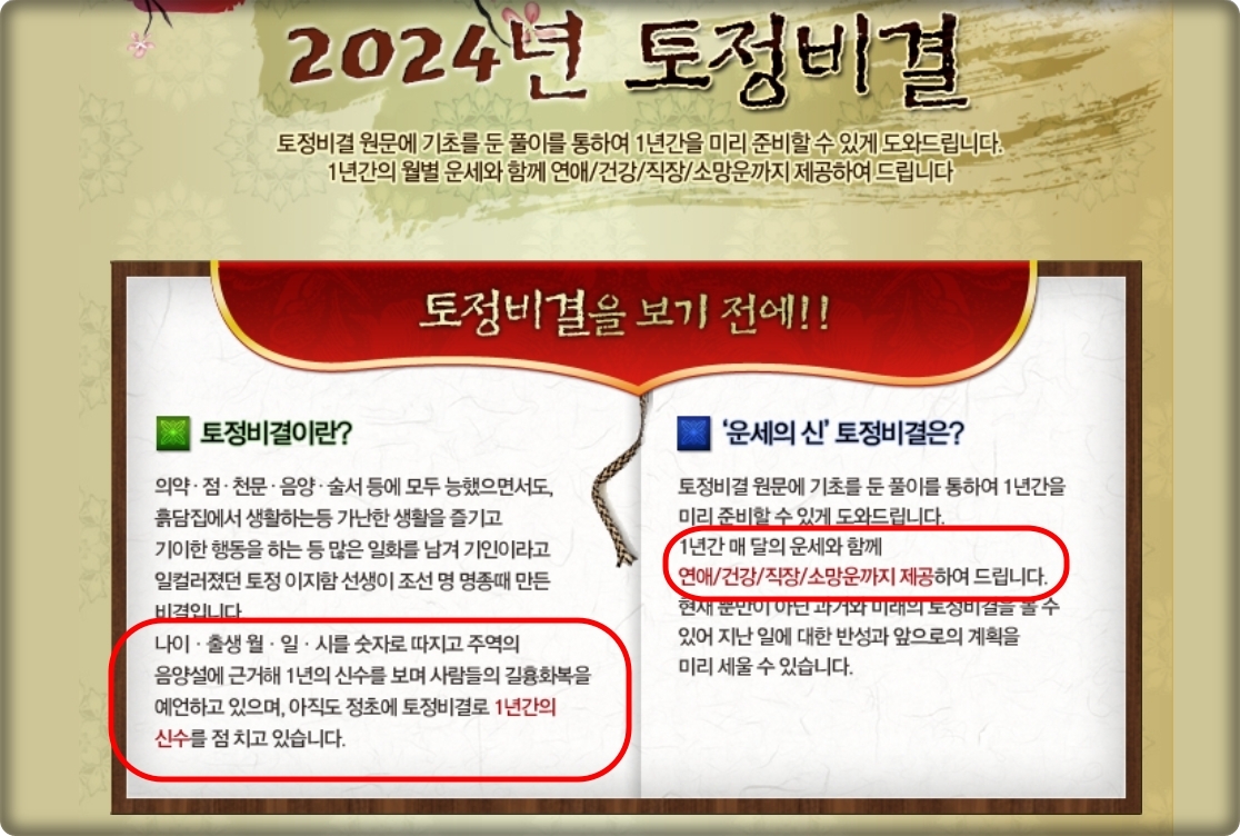 해석이 풍부한 토정비결 무료 2024 보기.