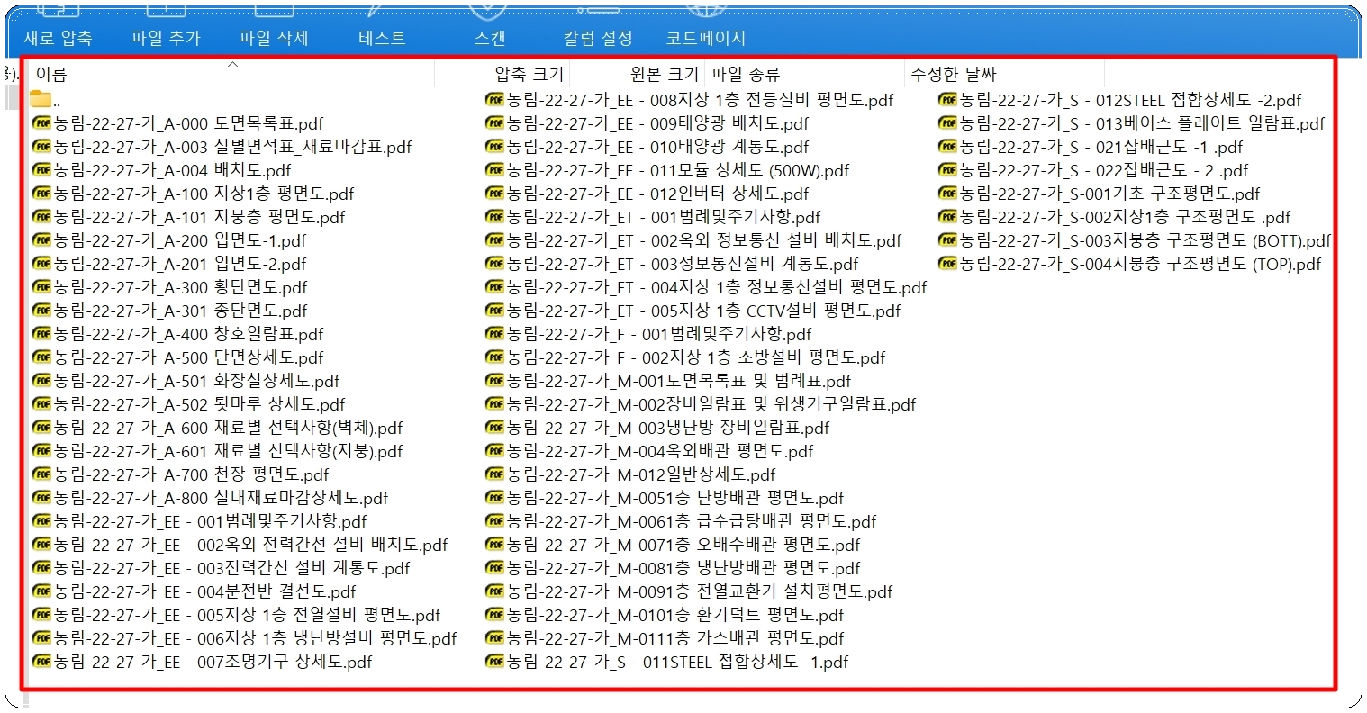 저는 농가주택 표준설계도 인허가용 자료를 다운로드 받아 보았는데요. 압축 파일 안에 들어 있는 문서를 살펴보니 꽤 많은 설계도 파일이 포함되어 있음을 알았습니다. 확장자가 PDF로 되어 있는 것으로 보아 PDF 뷰어로 열람할 수 있겠네요.