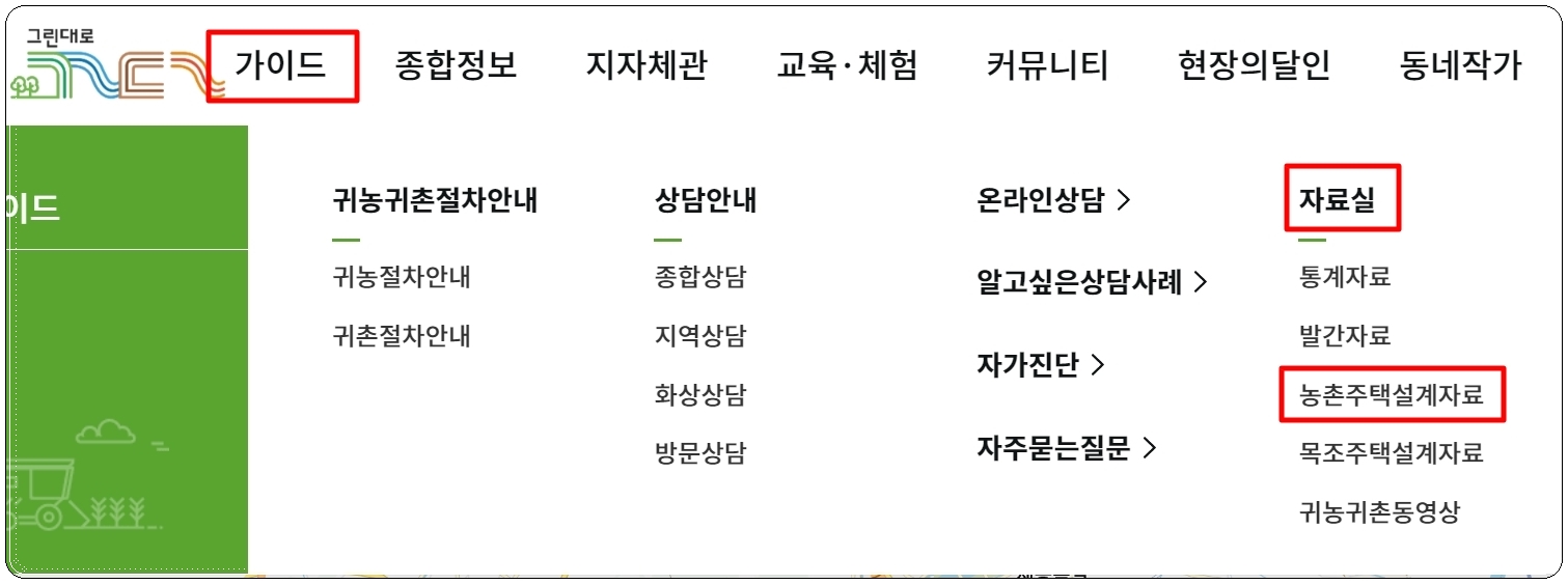 그린대로 사이트에 접속하면 메뉴에서 [가이드]를 선택해주세요. 그럼 귀농귀촌절차안내, 상담안내, 온라인상담 등의 카테고리가 나타나는데요. 여기에서 자료실 카테고리에 속한 "농촌주택 설계자료" 메뉴를 선택합니다.