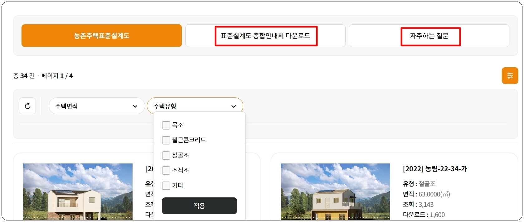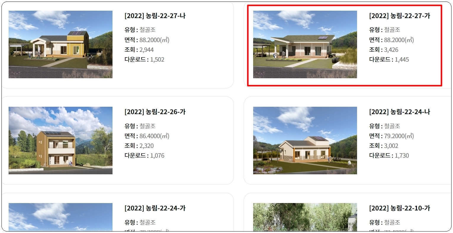 해당 리스트에서 보이는 농가주택의 경우 목조, 철근콘트리트, 조적조, 철골조, 기타와 같이 주요 자재를 중심으로 구분이 가능합니다. 추가로 면적도 제각각이죠. 자신에게 맞는 주택면적과 유형으로 조건을 설정한 상태에서 마음에 드는 디자인의 농가주택 표준설계도를 선택하면 됩니다.