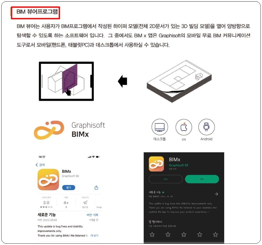 앞서 3D 도면 자료에 대해 언급했었는데요. 해당 자료를 열어보려면 컴퓨터나 스마트폰에 BIM 뷰어 프로그램을 설치하면 됩니다. 그럼 위와 같이 3D 모델링이 되어 있는 건축물 모양을 확인할 수 있어요.