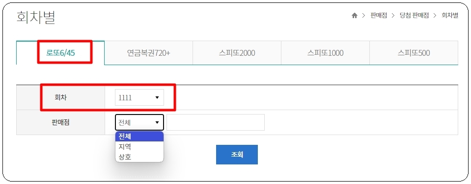동행복권 사이트에서는 로또1등과 더불어 연금복권, 스피또에 대한 1등 및 2등 당첨지역 정보를 제공하고 있는데요. 이번 시간에는 로또6/45를 중심으로 살펴보겠습니다. 1등 판매점 정보를 얻고 싶은 회차를 선택한 후 [조회] 버튼을 눌러주세요.