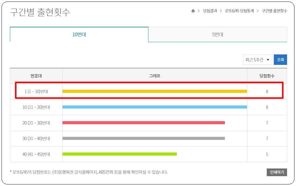 구간별 출현횟수 자료를 보니 1번과 10번 사이의 숫자가 최근 5주간에 가장 많이 출현을 했었네요.