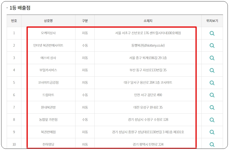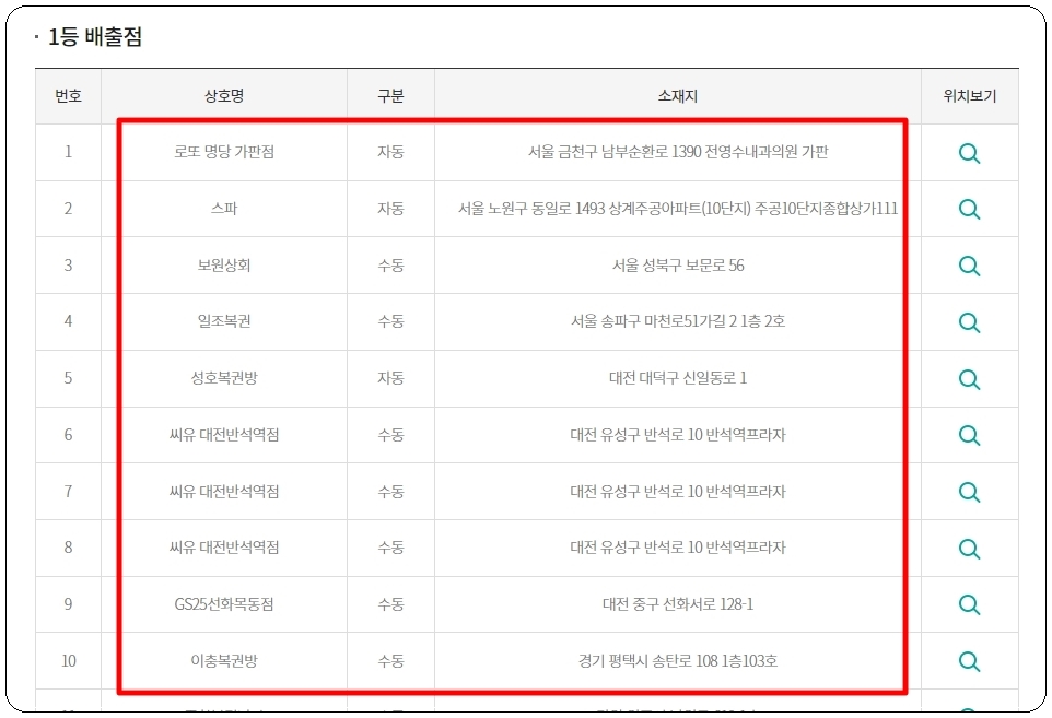 최근 발표된 1등 판매점 목록을 뽑아 보았습니다. 이렇게 상호명, 자동 및 수동 여부, 소재지를 정확하게 알려주는데요. 옆에 있는 위치보기 버튼을 누르면 지도 맵을 통해 어느 위치에 있는지 편하게 보는 것도 가능합니다.