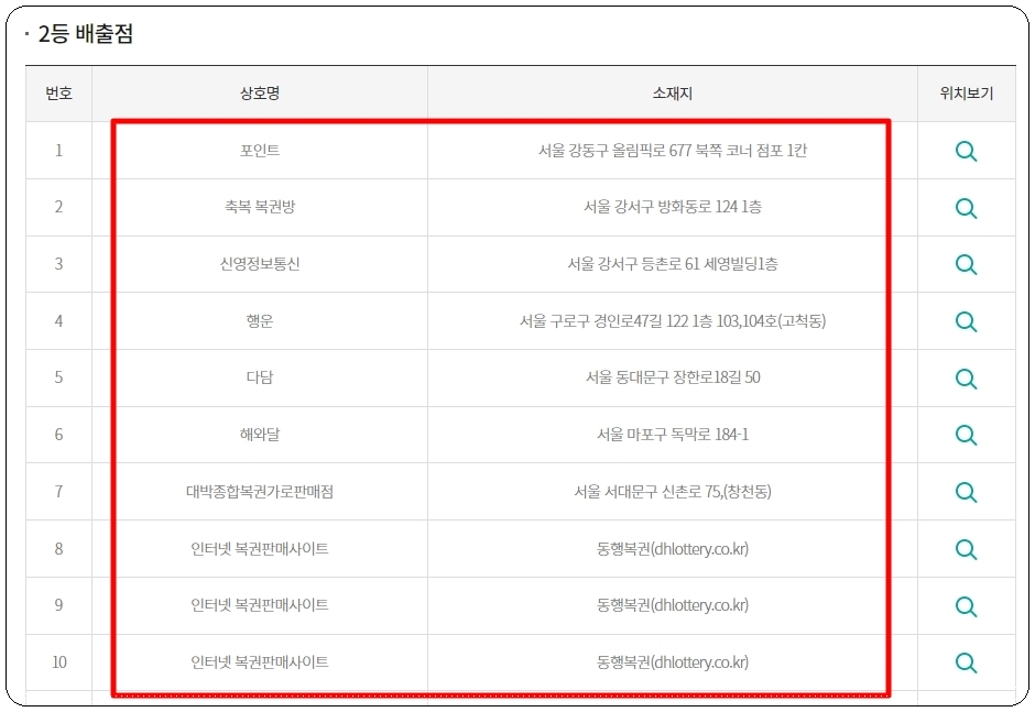 우리가 찾던 로또 당첨지역 정보가 나타났습니다. 서울, 부산, 대구, 인천, 경기 등 여러 지역에 걸쳐서 1등과 2등이 골고루 나타났네요. 정말 부럽습니다. 2등의 경우에는 서울 쪽이 꽤 많네요. 동행복권 사이트에서 구매한 경우에도 당첨이 된 적이 있음을 알 수 있습니다.