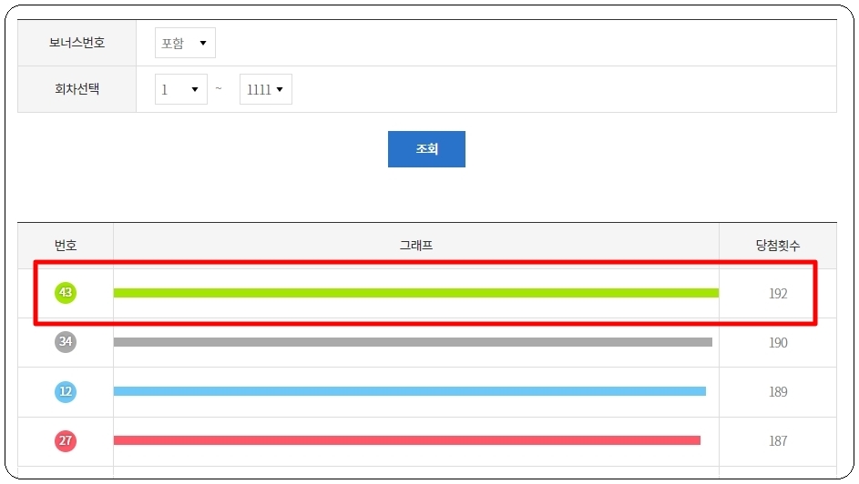 1회부터 1111회까지 43번이 192회로 가장 많이 추첨이 되었었네요. 그 다음은 34와 12가 2위와 3위를 차지하고 있습니다.