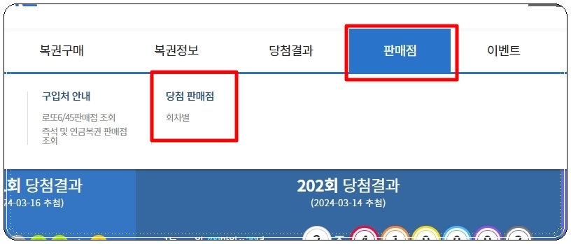일단 사이트에 접속하면 메뉴에서 [판매점]을 선택해 주세요. 그럼 하위 메뉴에 "구입처 안내"와 "당첨 판매점"이 나타나는데요. 두 번째 메뉴를 선택하면 됩니다.