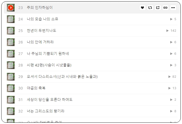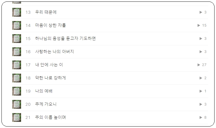 검색 결과를 통해 10개 정도의 플레이 리스트가 나타났습니다. 여기에 더하여 "복음성가" 또는 "CCM"이라고 검색하면 굉장히 많은 최신 곡을 찾을 수 있습니다. 일단 여기에 있는 것만 선택해 보도록 하겠습니다.