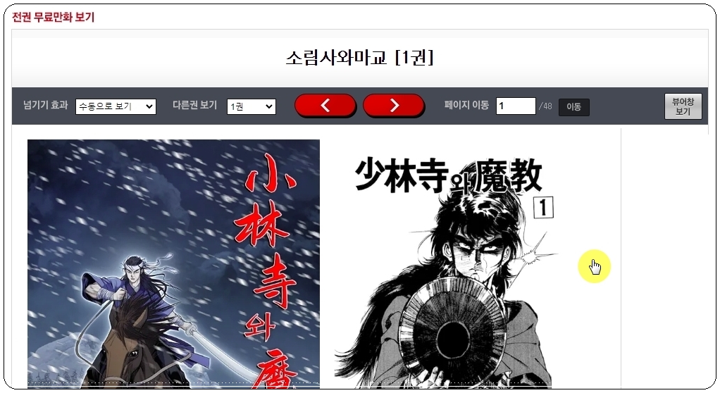 마음에 드는 작품에 썸네일이나 타이틀을 마우스로 클릭하면 바로 감상할 수 있는 페이지가 열립니다. 만화 감상 전용 페이지에서는 한 화면에 두 개의 페이지가 나타나는데요. 오른쪽 페이지를 클릭하면 다음장으로 넘길 수 있습니다.