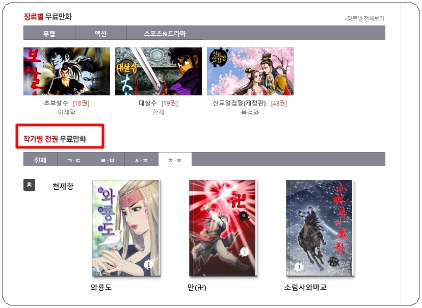 이곳에서는 크게 두 가지로 작품을 분류하고 있는데요. 첫째는 장르에 따라서이고, 둘째는 작가에 따라서 구분을 합니다. 좋아하는 작가의 작품이 있다면 작가별 전권 무료 만화 카테고리를 살펴보아 주세요. 국내 무협 및 액션 작가의 작품이 꽤 많습니다.