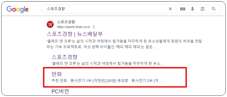 가장 먼저 사이트에 접속해야 하는데요. 스포츠 경향 공식 홈페이지에 접속해 주세요. 구글에서 검색을 하게 되는 경우 [만화 메뉴]를 바로 선택할 수 있습니다.