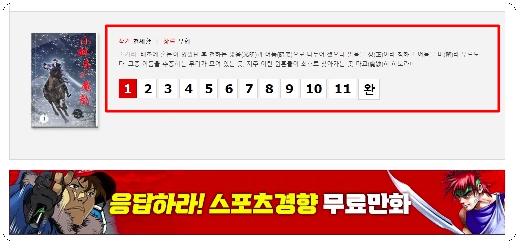 추가적으로 감상 화면에서 스크롤을 내려보면 줄거리가 나와요. 스포츠 경향 무료 만화 작품을 선택할 때 여기 있는 줄거리를 참고하시길 바랍니다.