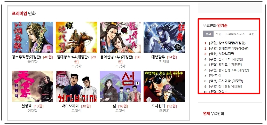 꽤 많은 만화 작품을 다루고 있기 때문에 어떤 것을 선택할지 고민이 되실 텐데요. 그런 경우에는 스포츠 경향 사이트 우측에 있는 인기 순위를 확인해 보시기 바랍니다. 장르별로 무협, 드라마, 스포츠, 액션 작품 중에서 어떤 것이 가장 인기가 있는지 쉽게 확인할 수 있습니다.