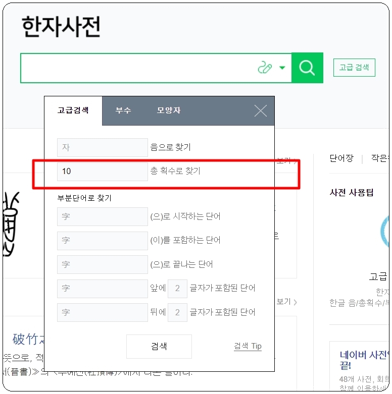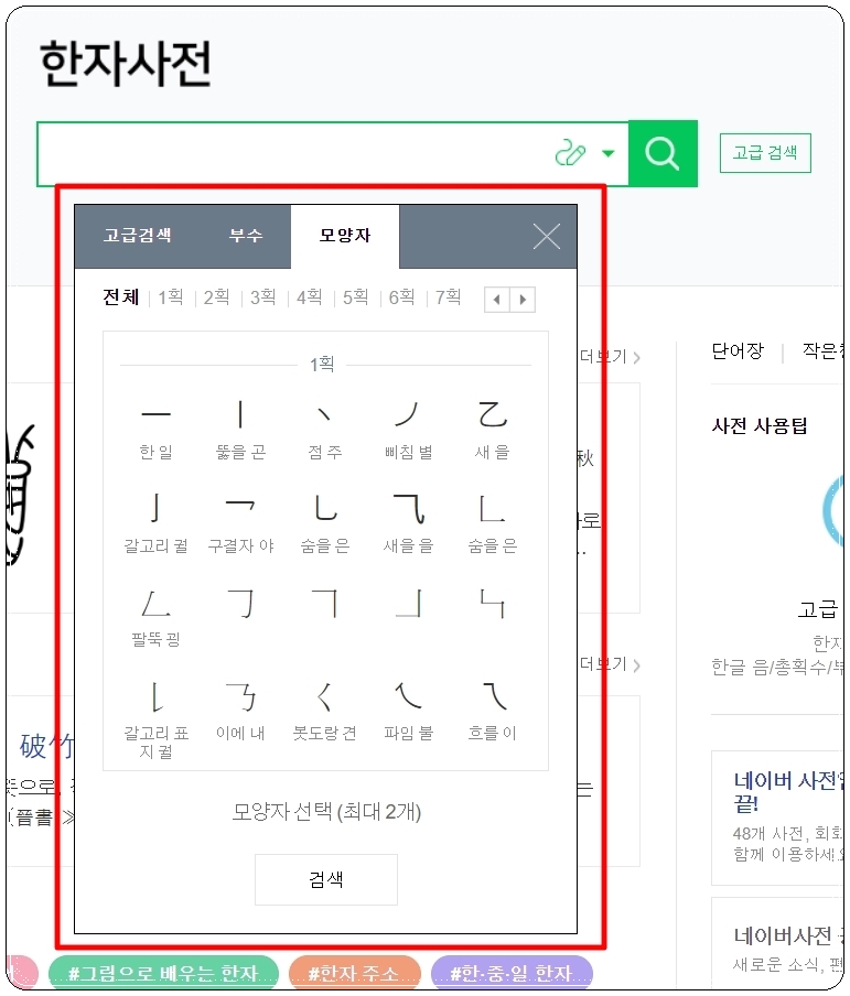 또 다른 방법으로 한자 찾기 하는 방법을 알려 드릴게요. 검색창 오른편에 있는 고급 검색 버튼을 클릭해 보세요. 그럼 여러 가지 방식으로 진행할 수 있는 [한문 검색창]이 하나 열리는데요. 음으로, 총 획수로, 부분 단어로, 부수로, 모양자로 한자 찾기를 할 수 있습니다.