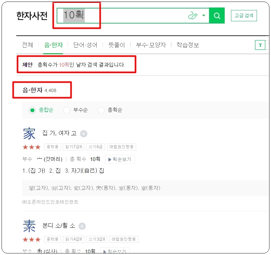 저는 총 획으로 한자 찾기를 진행해 보았습니다. 10개의 획을 가진 문자를 4,408개나 찾을 수 있네요.