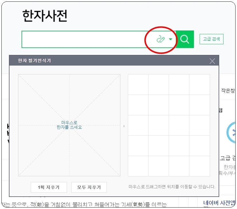 사이트에 접속하면 검색창이 하나 나타나는데요. 검색창 안에 연필 모양의 아이콘이 있습니다. 이 아이콘을 선택하면 [필기 인식기 창]이 나타나는데요. 여기에 한자의 획을 하나씩 그려 넣어 보세요. 그럼 우리가 찾고자 하는 문자를 입력 및 검색해 줍니다.