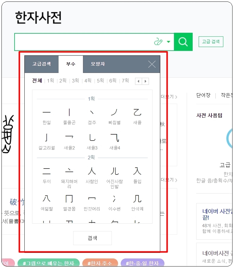 또 다른 방법으로 한자 찾기 하는 방법을 알려 드릴게요. 검색창 오른편에 있는 고급 검색 버튼을 클릭해 보세요. 그럼 여러 가지 방식으로 진행할 수 있는 [한문 검색창]이 하나 열리는데요. 음으로, 총 획수로, 부분 단어로, 부수로, 모양자로 한자 찾기를 할 수 있습니다.