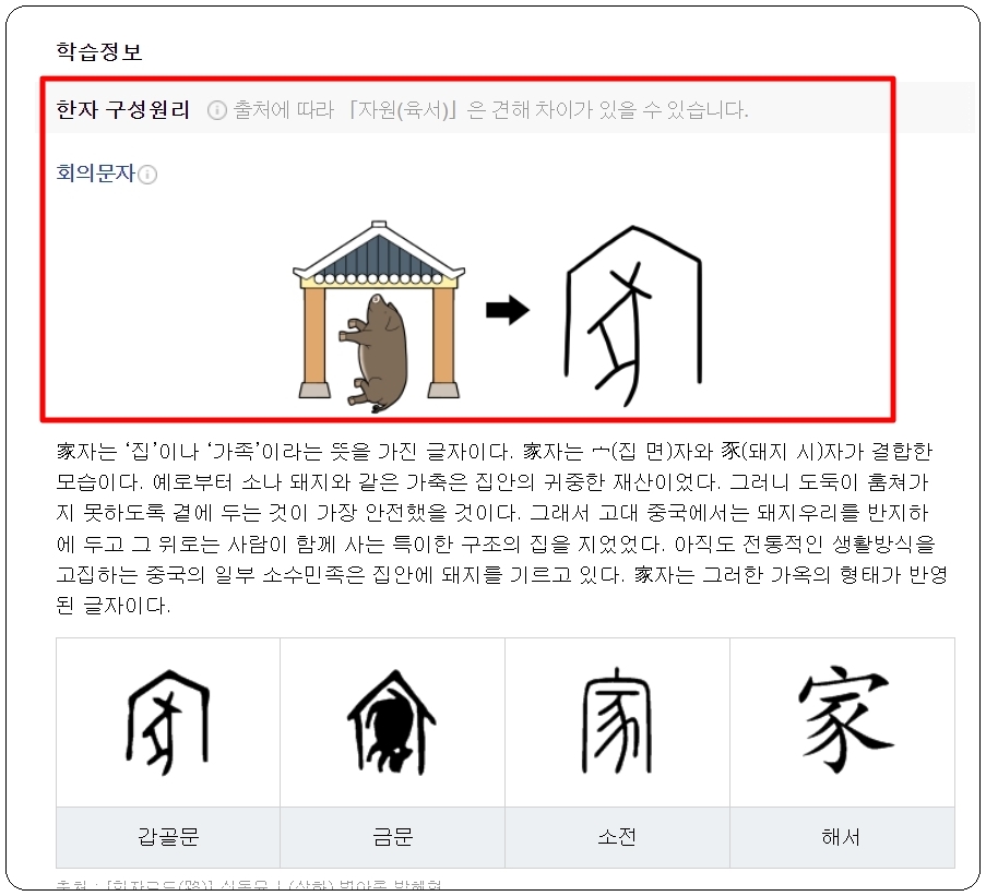 저는 "집 가"라는 문자를 클릭해 보았습니다. 이에 따라 해당 한자에 대한 부수, 모양자, 총 획수, 유니코드, 난이도, 뜻 등 다양한 사전 정보를 얻을 수 있었습니다. 연관 단어에 속하는 유의어도 정말 많네요. "획순 보기"를 통해 어떤 순서로 쓰면 되는지 배울 수 있었어요.