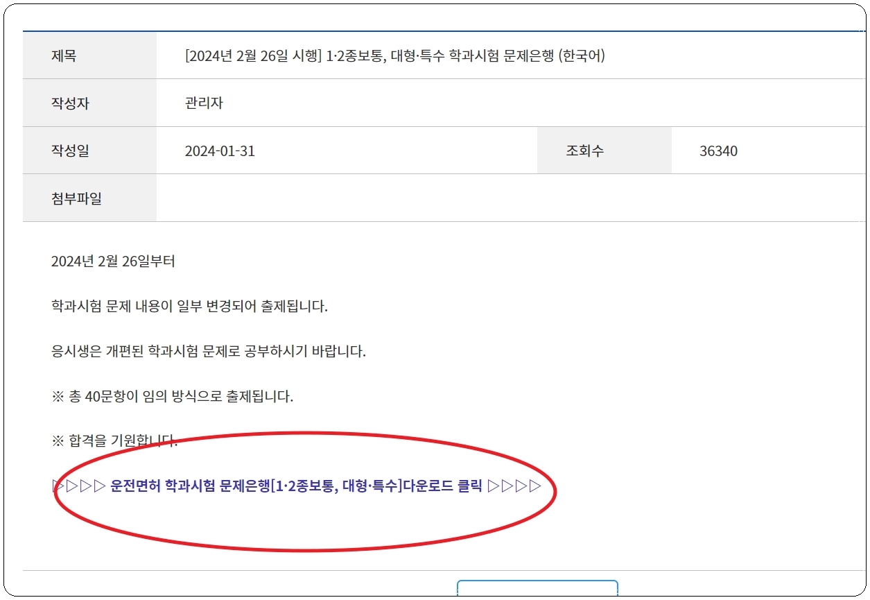 새롭게 열린 페이지를 보면 5개의 게시글로 구성된 게시판이 하나 나타나는데요. 최근 2024년 2월 26일에 시행이 되는 운전면허 필기시험부터는 여기에 있는 자료를 이용해야 한다고 합니다. 조회수를 보면 알겠지만, 많은 사람들이 사용한 것을 확인할 수 있어요. 이륜자동차 필기시험 예상문제 자료도 마련되어 있으니 필요한 분들은 이용하시길 바랍니다. 청각장애인과 비문해자를 위한 필기시험 대비 프로그램도 마련되어 있어요.