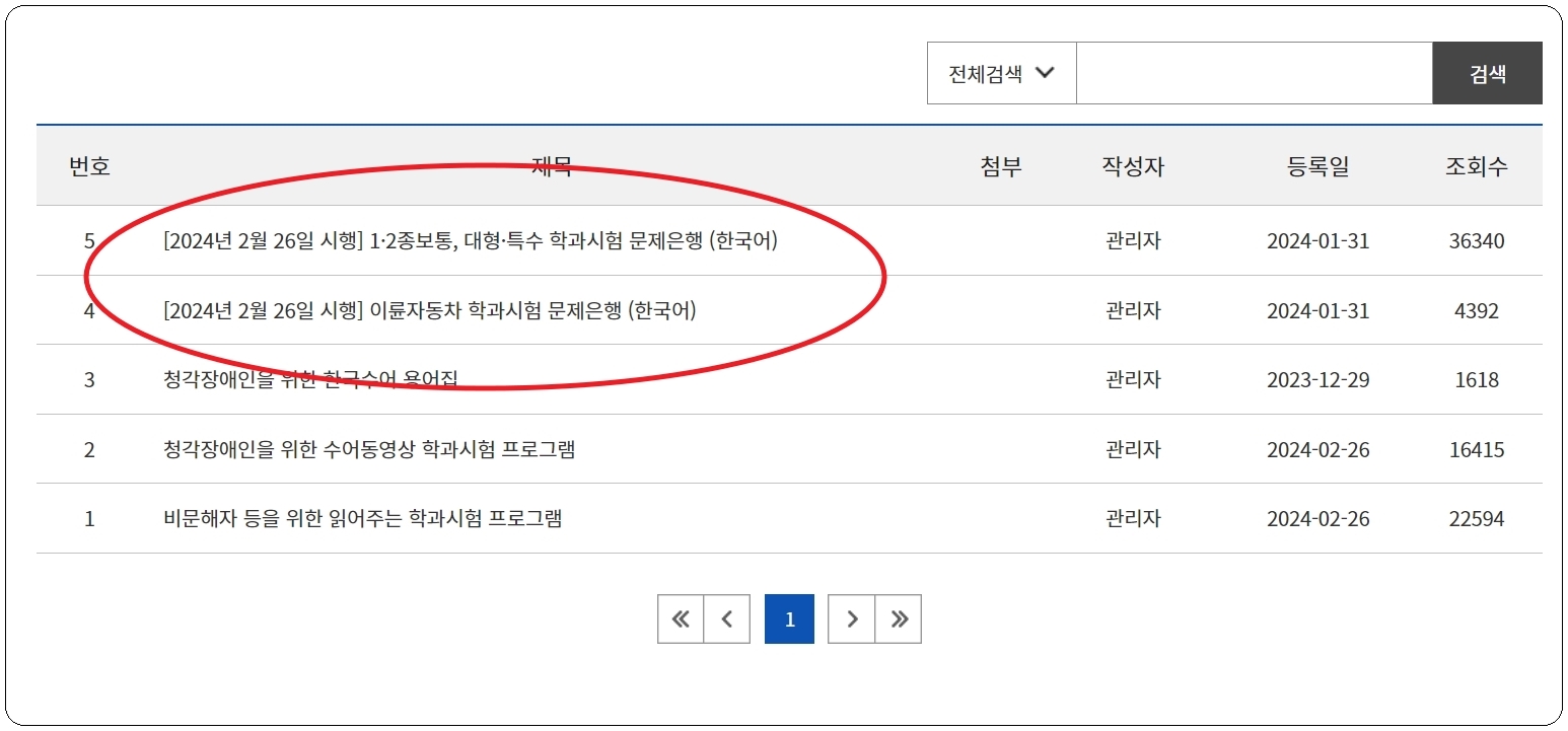 새롭게 열린 페이지를 보면 5개의 게시글로 구성된 게시판이 하나 나타나는데요. 최근 2024년 2월 26일에 시행이 되는 운전면허 필기시험부터는 여기에 있는 자료를 이용해야 한다고 합니다. 조회수를 보면 알겠지만, 많은 사람들이 사용한 것을 확인할 수 있어요. 이륜자동차 필기시험 예상문제 자료도 마련되어 있으니 필요한 분들은 이용하시길 바랍니다. 청각장애인과 비문해자를 위한 필기시험 대비 프로그램도 마련되어 있어요.