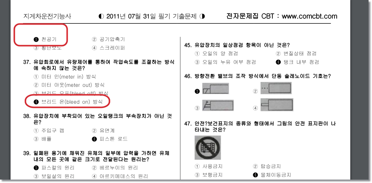 교사용은 이렇게 각 문항에 답이 표시가 되어 있습니다. 이 자료는 공부용으로 사용하기에 좋습니다. 짧은 시간에 많은 문제의 내용을 익힐 때 사용하기에 정말 좋죠. 유압회로, 유압장치, 방향전환 밸브 등 지게차에 관련된 내용으로 구성된 기출문제를 많이 만나볼 수 있어요.