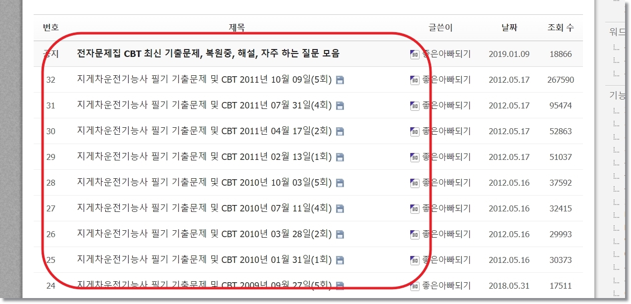 다운로드 받을 수 있는 지게차 필기시험 기출문제 자료로 구성된 게시판이 나타났습니다. 회차별로 잘 정리가 되어 있는데요. 조회수를 보면 아시겠지만, 꽤 많은 사람들이 이 자료들을 다운로드 했음을 알 수 있어요. 그럼 풀어보고 싶은 회차의 게시물을 선택해 주세요.