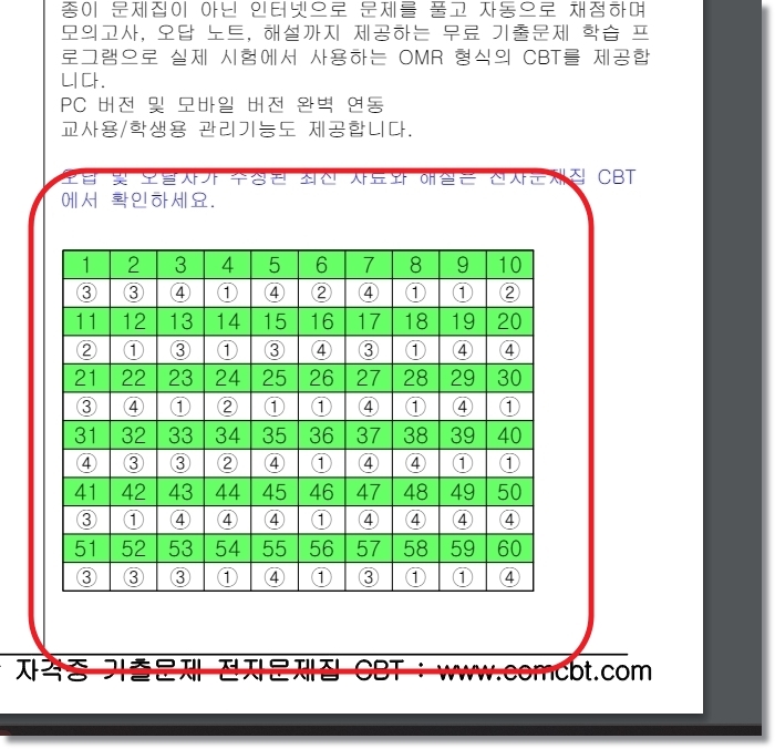 학생용 자료의 경우에는 이렇게 생겼습니다. 각 문항에 정답이 표시가 되어 있지 않아요. 그렇기 때문에 실력 테스트용으로 사용하기에 좋아요. 지게차 필기시험을 보기 전에 자신의 실력이 얼마나 되는지 알아볼 때 사용하면 좋습니다. 정답표의 경우에는 맨 마지막 페이지에 위치해 있으니 참고해 주세요.