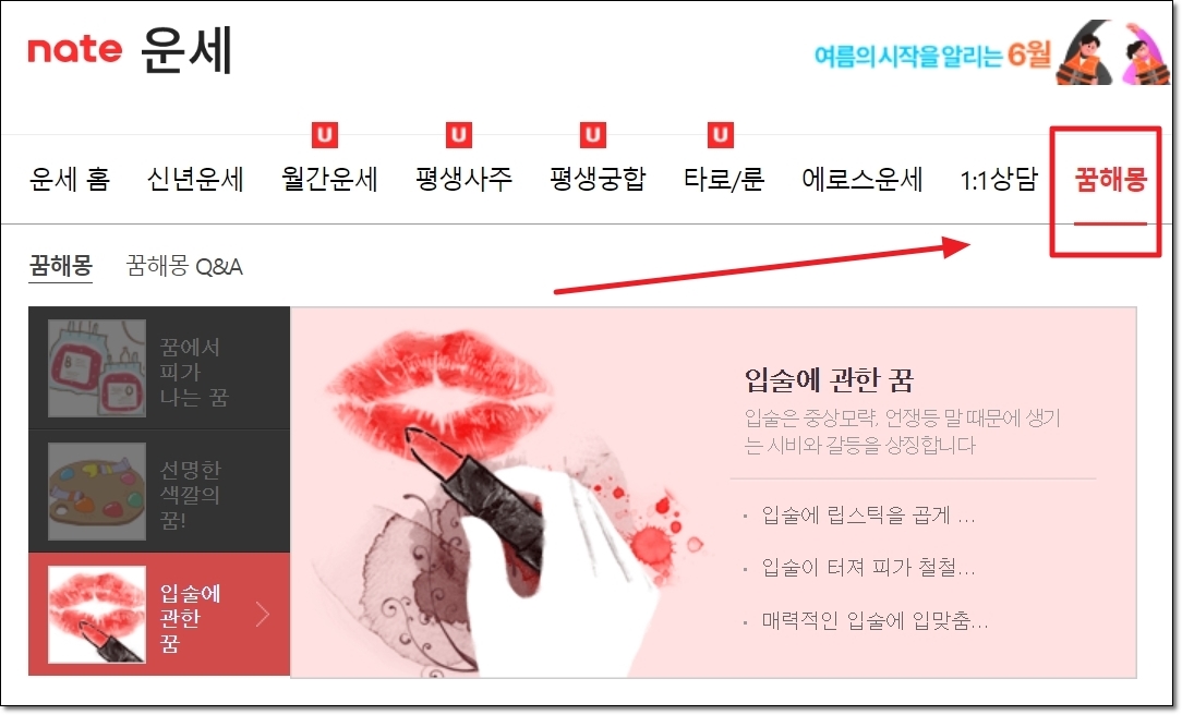 네이트 운세 사이트에 접속하면 메뉴에 여러 가지 역술 서비스가 보입니다. 여기에서 맨 우측에 있는 "꿈해몽"을 선택해 주세요. 가장 먼저 화면 상단에 보면 꿈에 관련된 이야기가 있는데요. 해몽에 관심이 많은 분이라면 한 번 읽어보는 것도 좋아요. Q&A 서비스도 제공하고 있으니 적극적으로 알아보고 싶을 때 이용해 보시길 바랍니다.