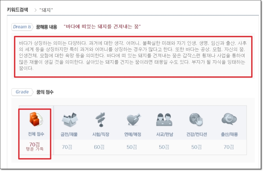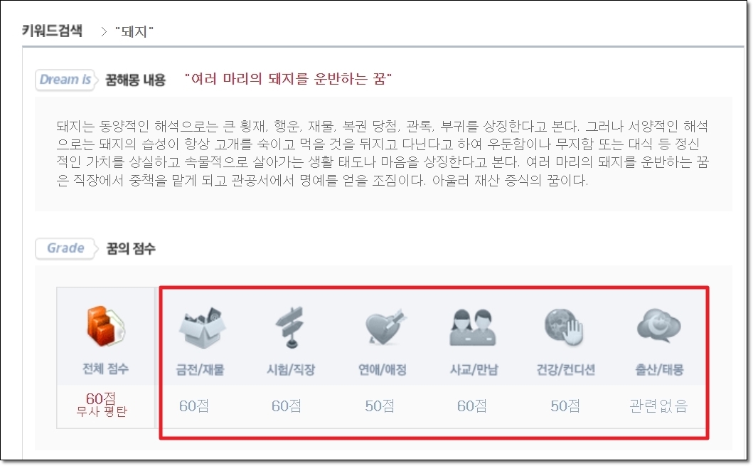 이번 시간에 이용할 꿈해몽 사이트의 경우에는 이렇게 풍부한 풀이 내용을 자랑합니다. 여기에 더하여 내가 꾼 꿈이 나에게 어떤 좋은 일을 가져다 주는지 점수로 알아볼 수 있어요. 전체적인 점수와 함께 6가지로 구분되어 금전, 시험, 연애, 사교, 건강, 출산에 관련된 내용을 알려주는데요. 꿈을 꾸었을 때 이것이 좋은 징조인지 아닌지 알아보고 싶을 때 유용합니다.
